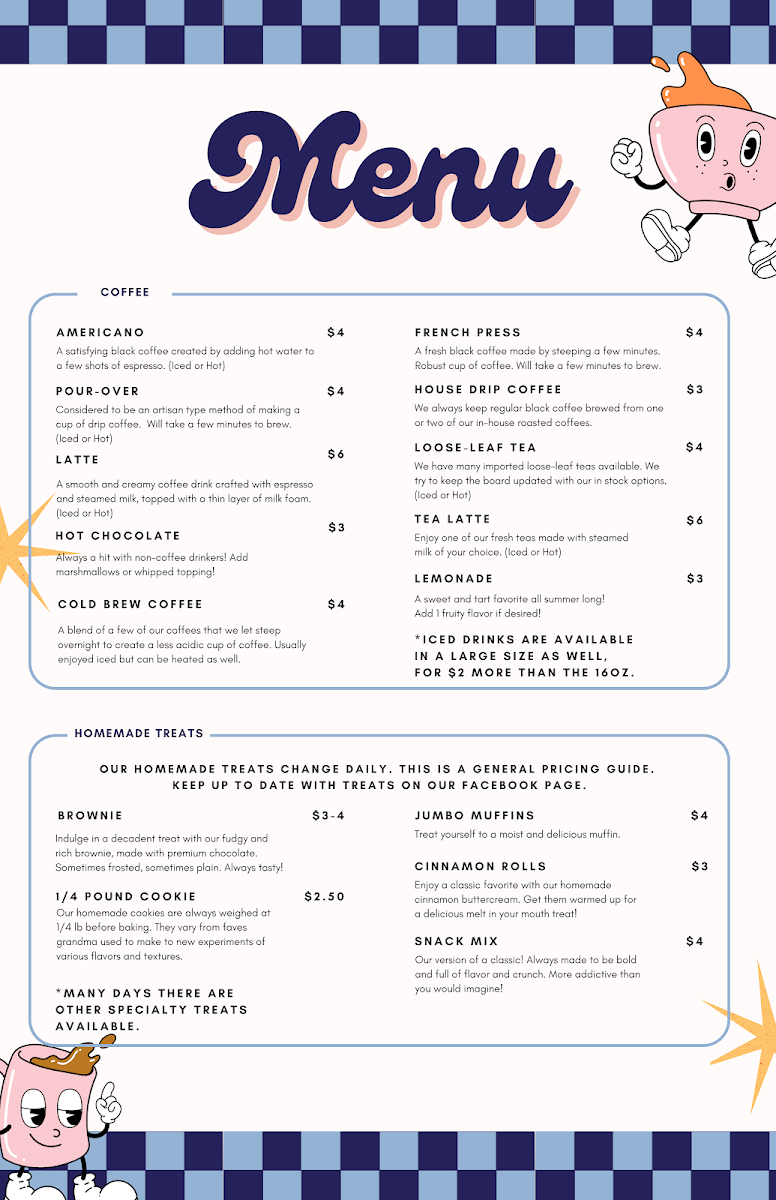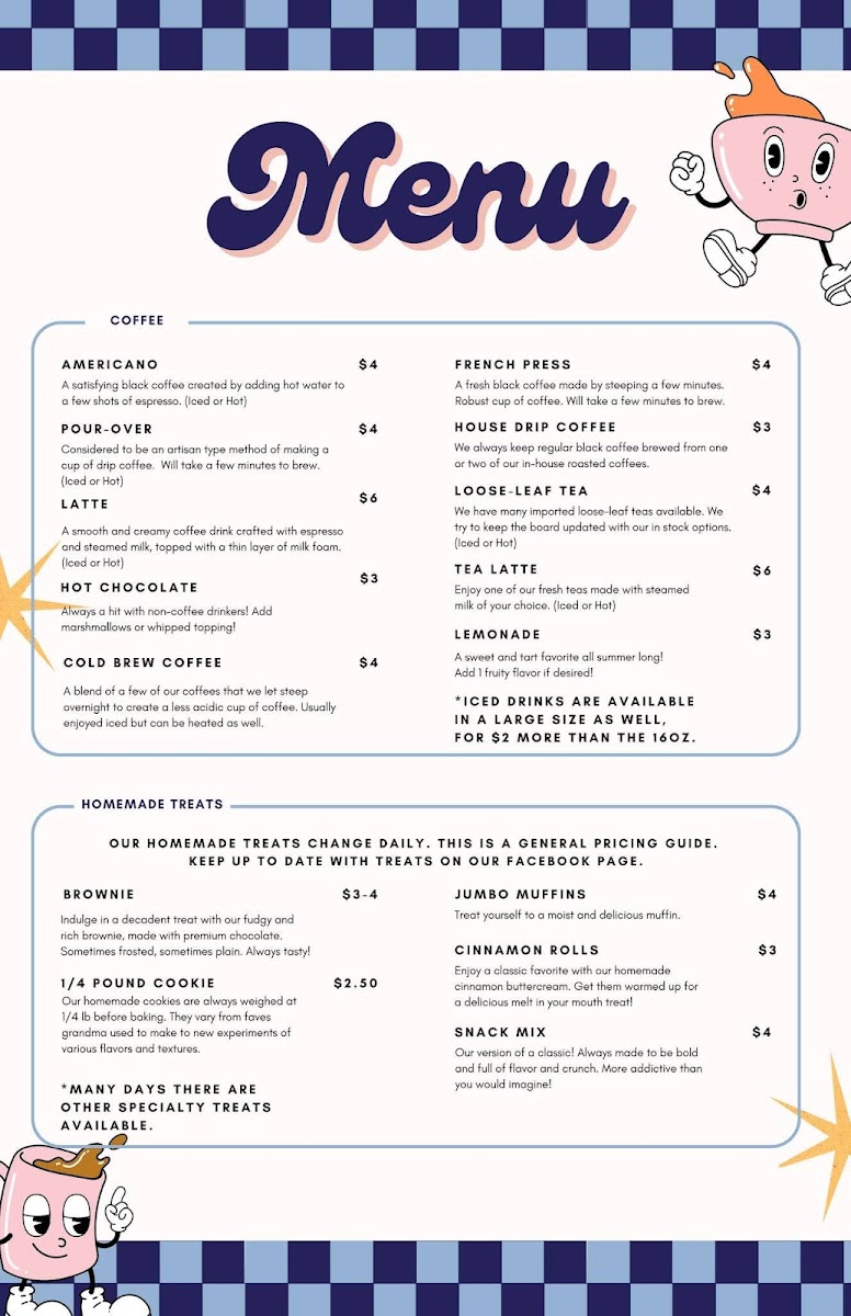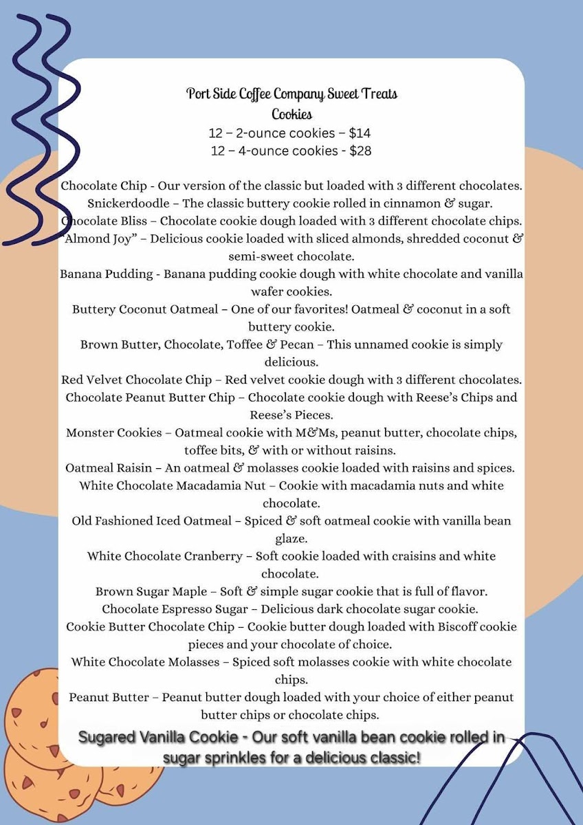 The Port Side Coffee Company Llc Menu offers a delightful selection of beverages and homemade treats, making it a must-visit spot for coffee lovers and those with a sweet tooth alike. For coffee enthusiasts, the menu presents a variety of options, including the rich and bold Americano, the smooth French Press, and the clean, crisp Pour-Over. If you're in the mood for something a bit more familiar, their House Drip Coffee is a comforting classic, while loose-leaf teas provide a refreshing alternative. Speaking of tea, the menu boasts some unique flavors like the aromatic Indian Masala Chai and the calming Rooibos Masala Chai, perfect for those seeking something a little more exotic. For a healthy twist, there’s also the Tumeric Cider and Holy Detox, which are both soothing and beneficial. The selection doesn’t stop at drinks. The homemade treats are a perfect complement to any beverage. From the rich, fudgy Brownie to the giant, soft 1/4 Pound Cookie, you’ll find something to satisfy any craving. The Jumbo Muffins and warm, gooey Cinnamon Rolls are must-tries, and the Snack Mix provides a savory balance to the sweet offerings. The latte menu is where Port Side Coffee Company really gets creative. Standouts like Bee’s Knees, a honey-infused delight, and Aloha, with tropical flavors, offer something different from the usual latte. The Blueberry Haze and S'mores lattes bring a playful twist, with the comforting taste of childhood favorites in every sip. There’s also the Honey Nut, a smooth and lightly sweet option. As for the tea lovers, Port Side doesn't disappoint. Beyond the regular Hot and Iced Teas, their Hot Tea Lattes are a fantastic option to enjoy a tea experience in a new way. If you're looking for something with a little more flair, their Evening Comfort and Herbal Energizer are relaxing options for winding down or boosting your energy, respectively. The selection of cookies and treats is another highlight of the Port Side Coffee Company Llc Menu, with classic favorites like the Chocolate Chip and Snickerdoodle cookies, alongside more unique options like Almond Joy and Buttery Coconut Oatmeal. For dessert lovers, the Banana Pudding is a creamy indulgence, and the Cinnamon Rolls are an absolute fan favorite. With a balance of traditional coffeehouse staples and inventive new flavors, the Port Side Coffee Company Llc Menu caters to a wide range of tastes, offering something for everyone, whether you’re in for a quick caffeine fix or a leisurely treat.